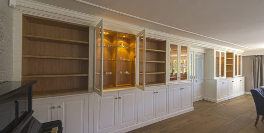 Op dit project een schitterende kamer en suite van 9 meter breed. Onderkasten uitgevoerd met bossing paneeldeurtjes. Bovenkasten uitgevoerd met vitrinedeurtjes. Spots in de plafonds achter de vitrinedeurtjes. Alle binnenwerken zijn van eikenhout. Dit geheel is afgewerkt met een prachtige kroonlijst tegen het plafond.